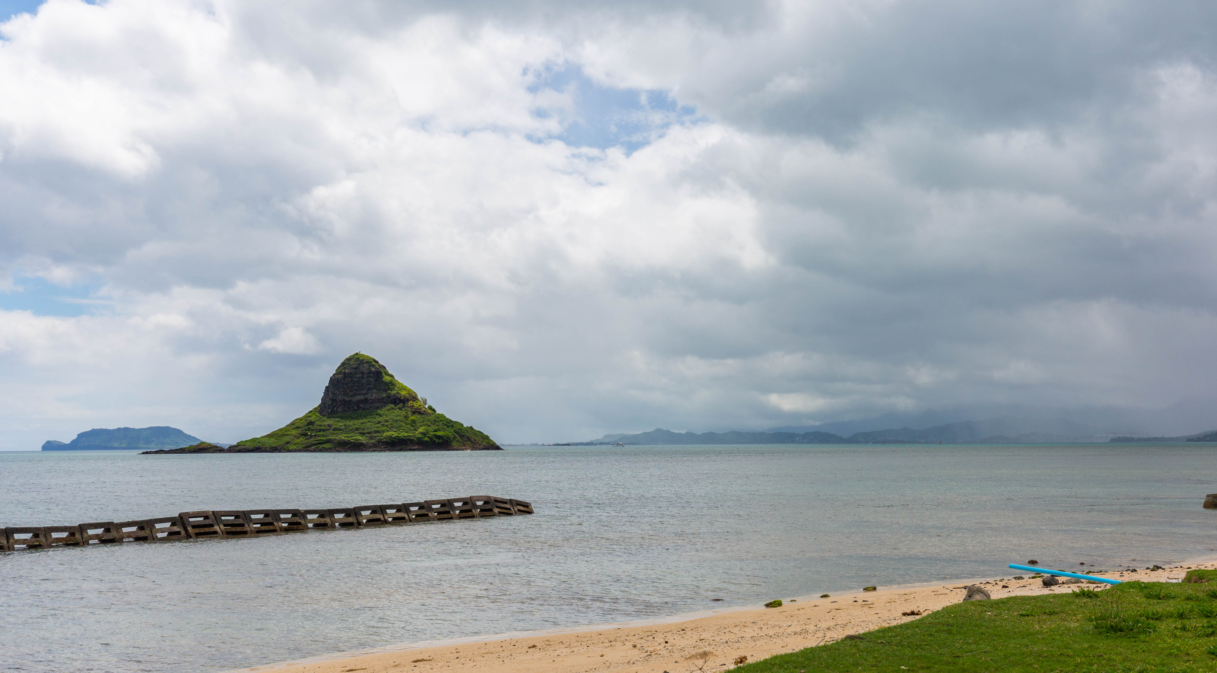 View south across Kane’ohe Bay with Mokoli’i Island, also known as Chinaman’s Hat on the left.